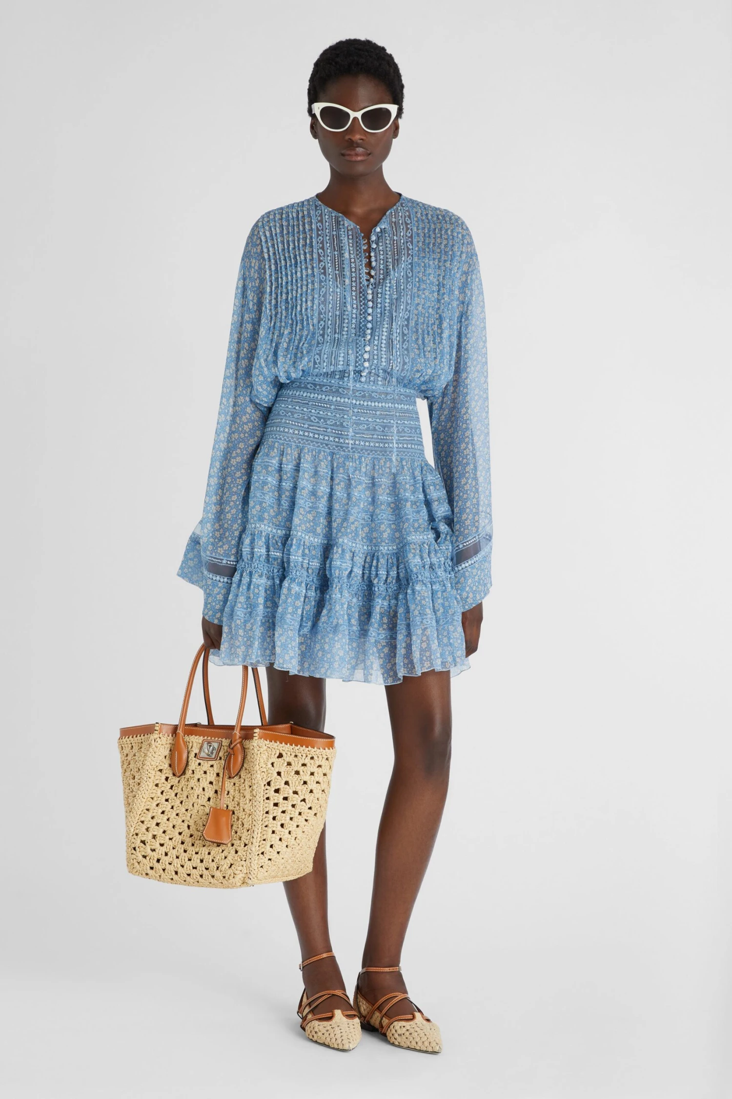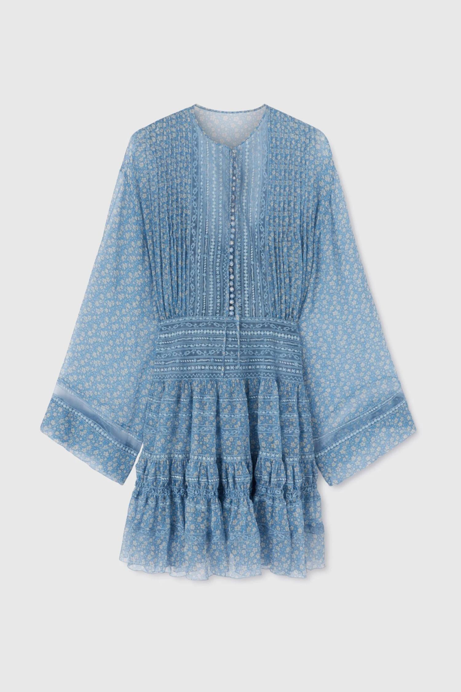 Short kaftan dress in pure silk crepon with white micro flower print on a light blue background. On the front plastron made with vertical borders of Valencienne lace, whose all different floral motifs are to be considered an Ermanno Scervino exclusive. The same lace is also found on the flounces of the skirt and on the long sleeves, which are wide at the bottom. Wrapped summarys allow for a wide front opening.
