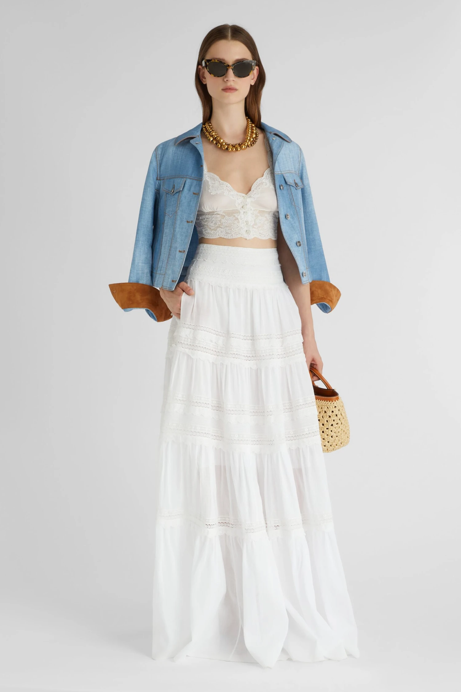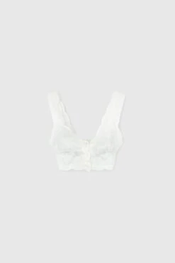 Short top in pure cotton muslin with sweetheart neckline. The straps are made of white Valencienne lace, as are the edge of the neckline and the armhole. The final edge of the top is embellished with a floral lace flounce and Valencienne lace micropois. The small cotton-bound summarys on the front simulate the fastening of the top, as if it were a shirt.