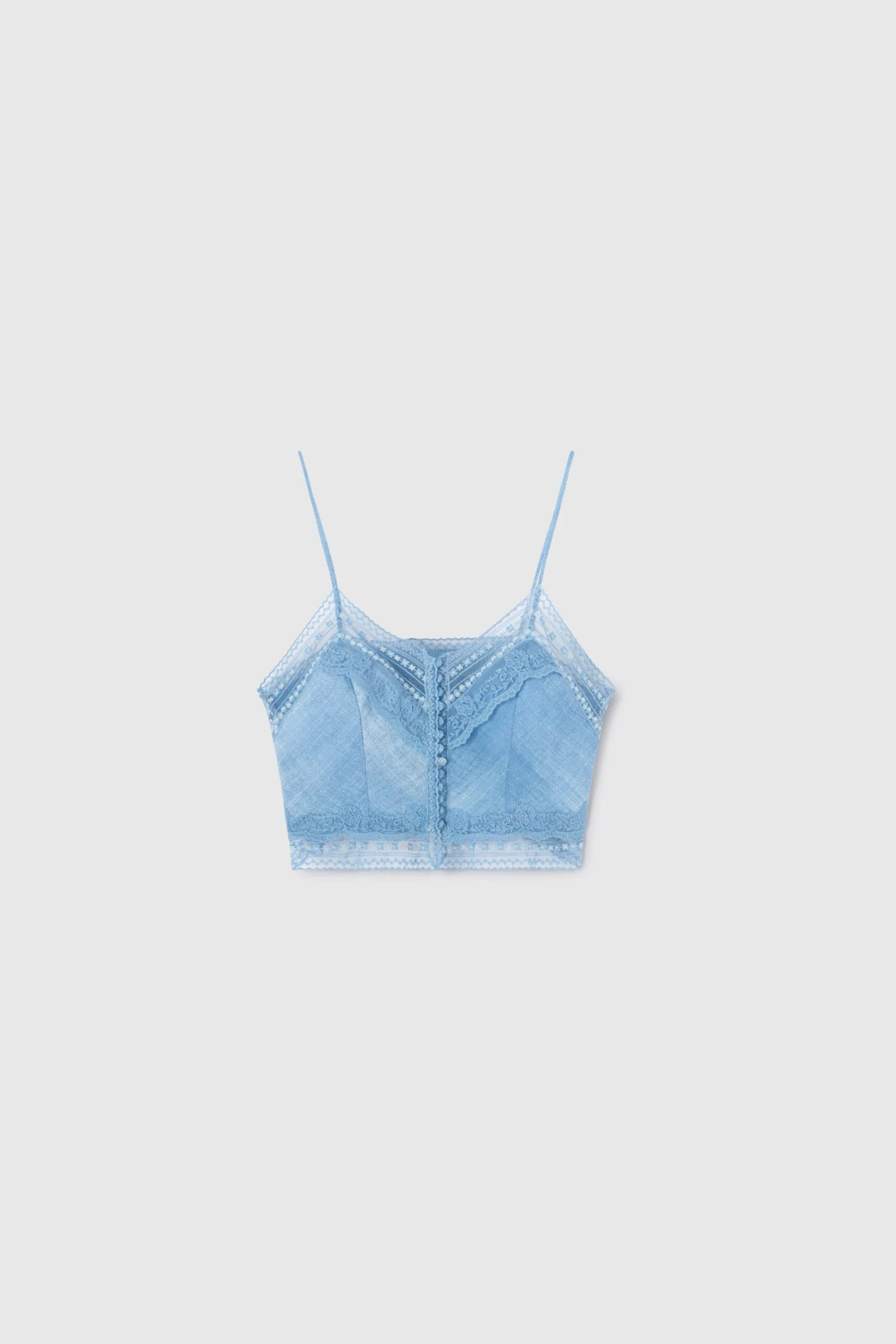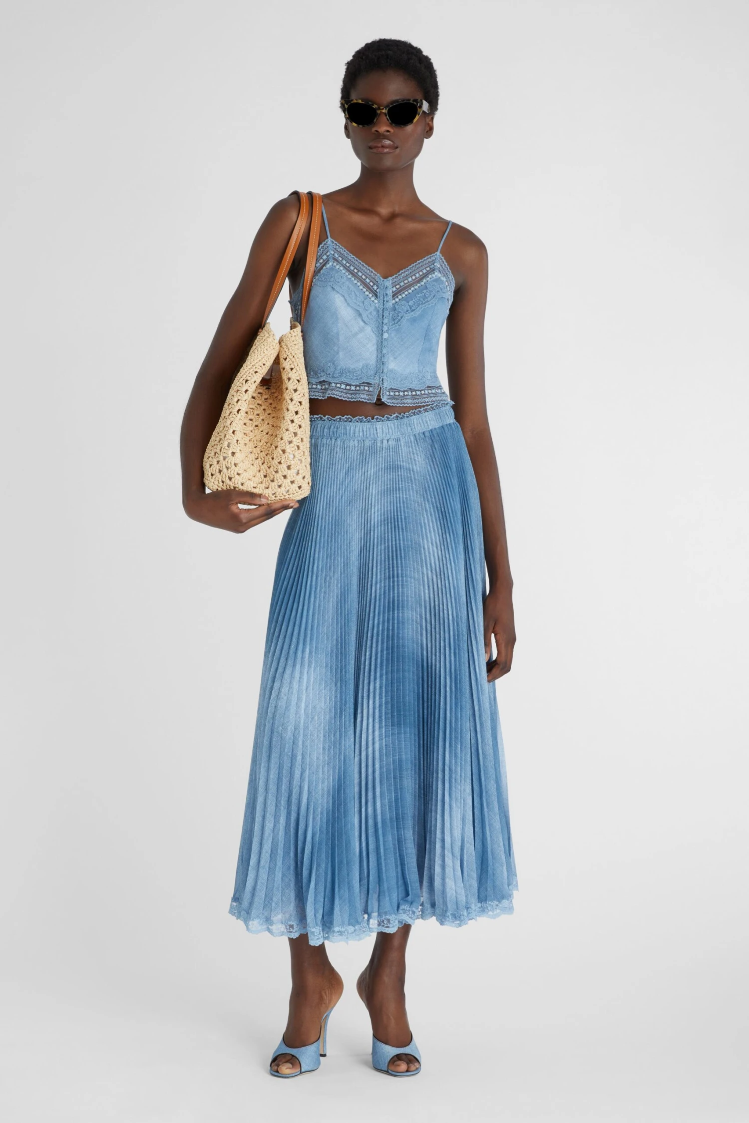 Short top with fine straps and V-neck, and front summary placket with banded summarys. The top is made of our iconic mid-blue denim-print viscose fabric. Valencienne lace appliques, both on the neckline and along the summary placket, which create movement and plays of transparency, make the garment precious and unique. The floral design alternating with geometric patterns of the valencienne lace are an Ermanno Scervino exclusive.