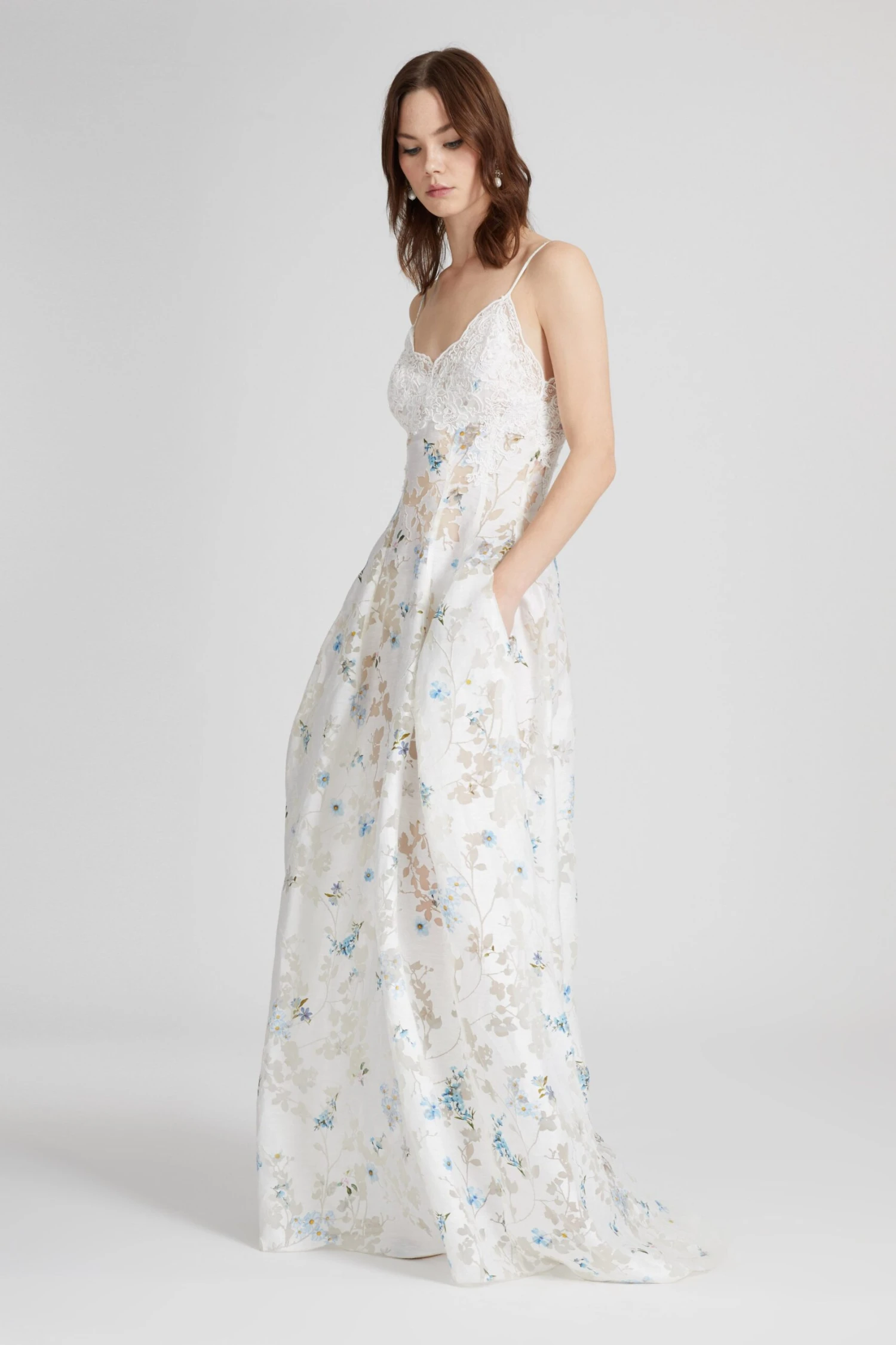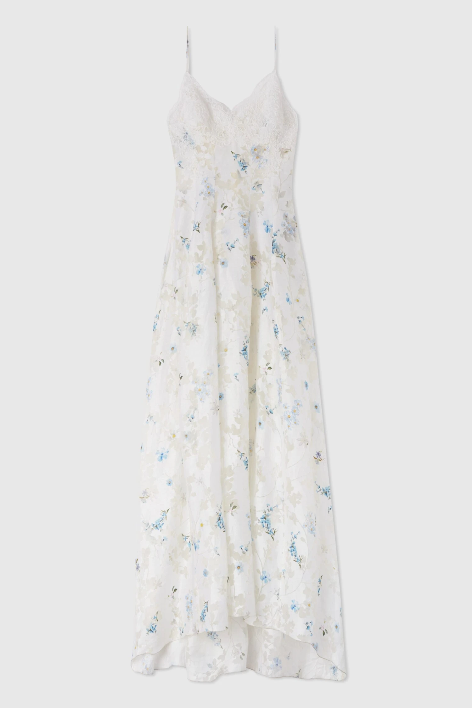 Silk blend long dress with deep scalloped V-neck with lace and hidden back zip. The particular floral motif, on which a micro flower print is placed, is made using the devore technique: a chemical process that erodes the fibre following a pre-established pattern.