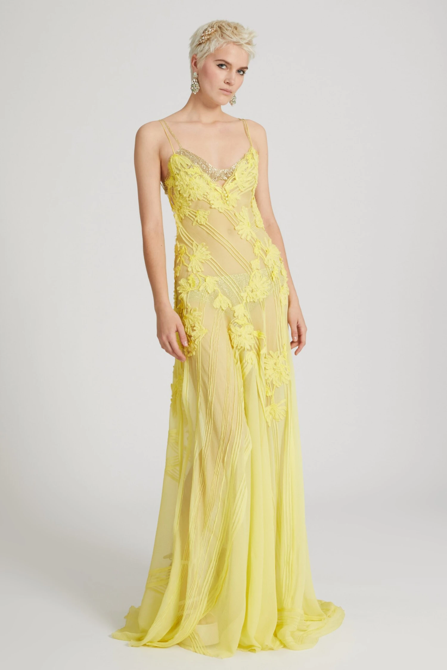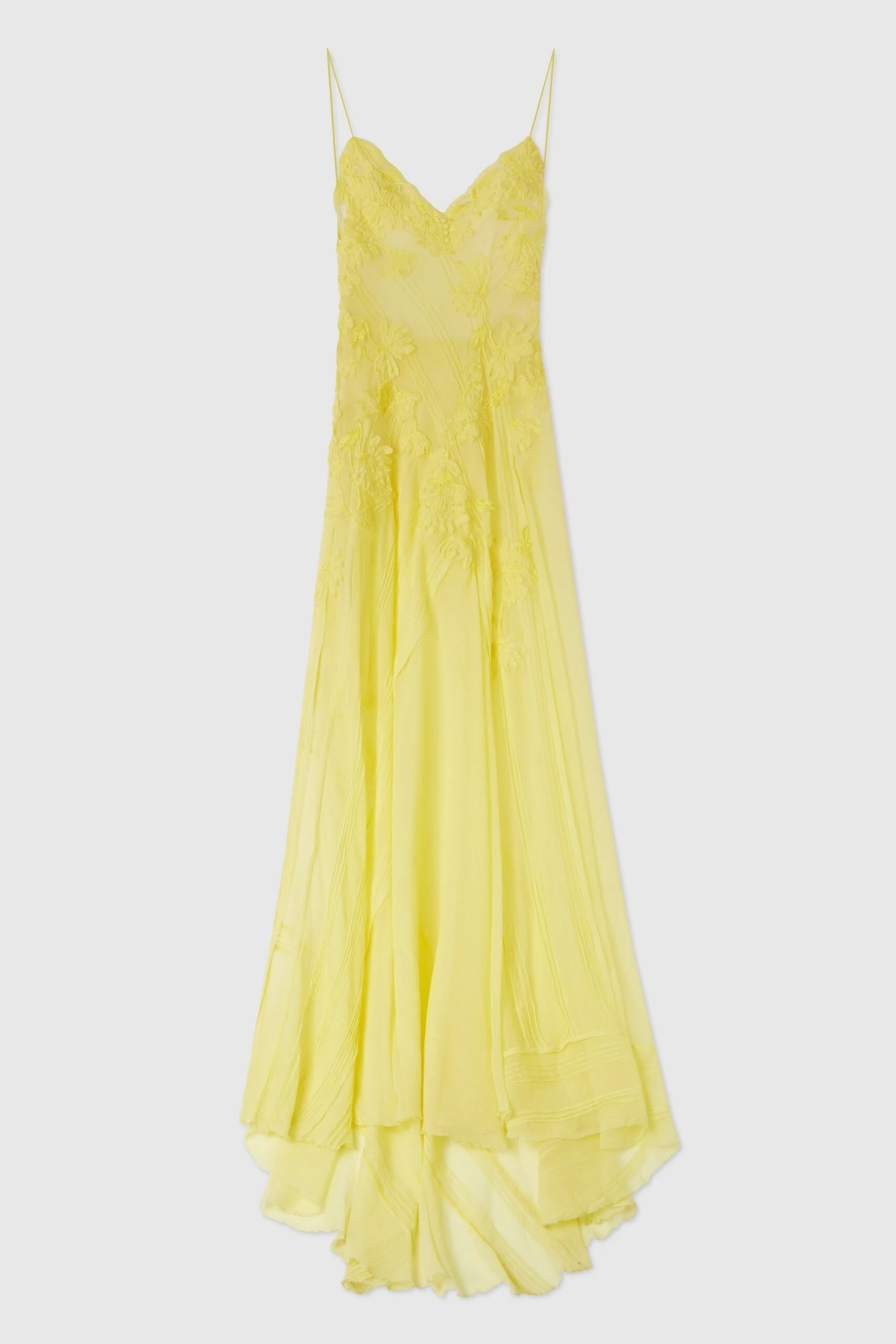 Long dress in pure silk chiffon with v-neckline. The straps are fine and cross at the back: they can be adjusted by means of a bow and allow the back to remain bare, through a sensual criss-crossing. The dress is embellished with an oblique pleated craftsmanship that emphasises the figure, alternating with handmade floral embroidery with silk tape, which is fuller at breast height and thins out along the bust and skirt. The neckline is embellished with a scalloped edge and three matching banded summarys.