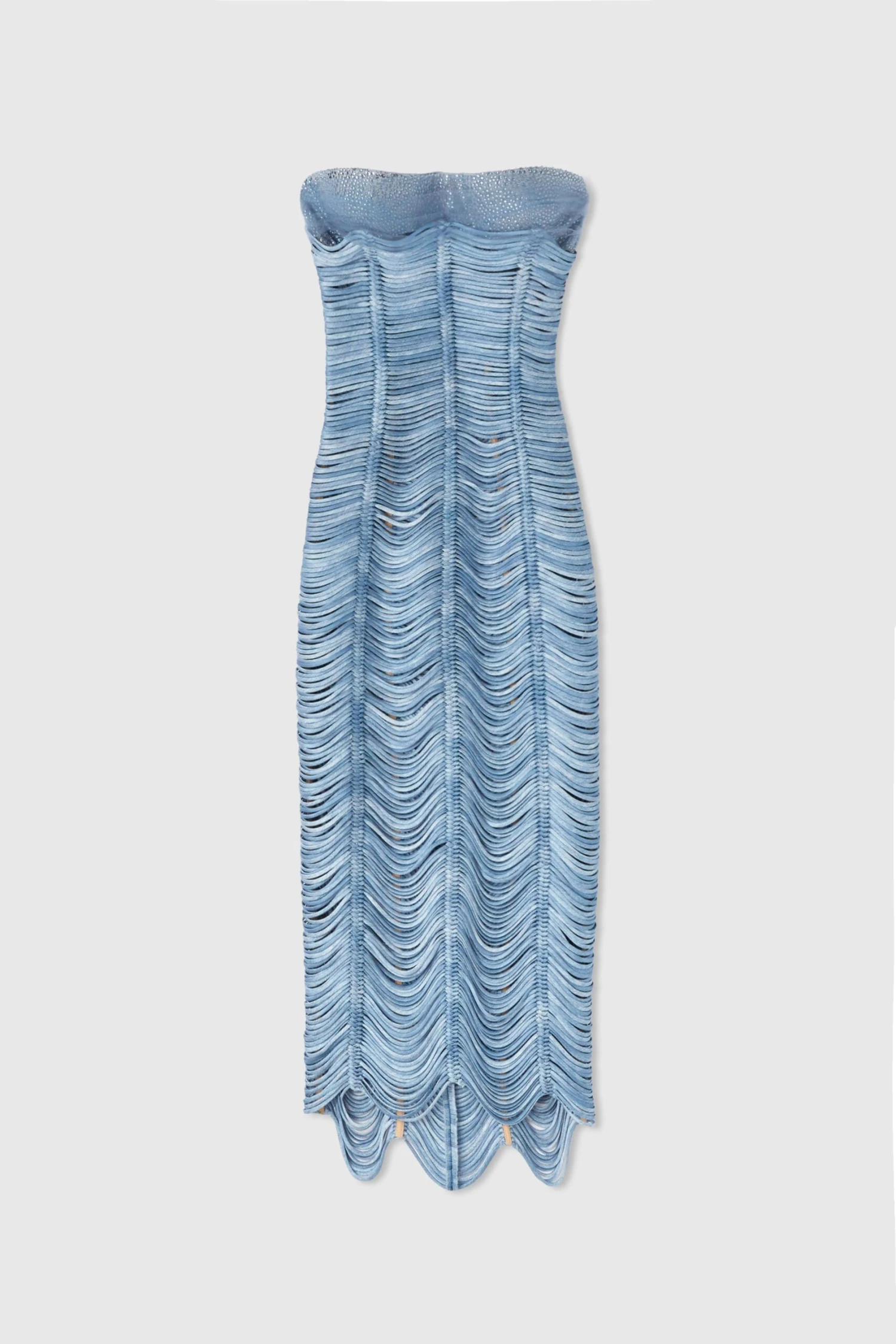 Stretch silk midi bustier dress with concealed back zip fastening. The top is special, made of toulle and studded with matching micro crystals for a layer effect. The dress is handcrafted using the special technique of soutache: a flat silk tape cord is created and sewn, twisting it around itself. The final effect is the result of manual work aimed at assembling all the flat cords that make up the garment.