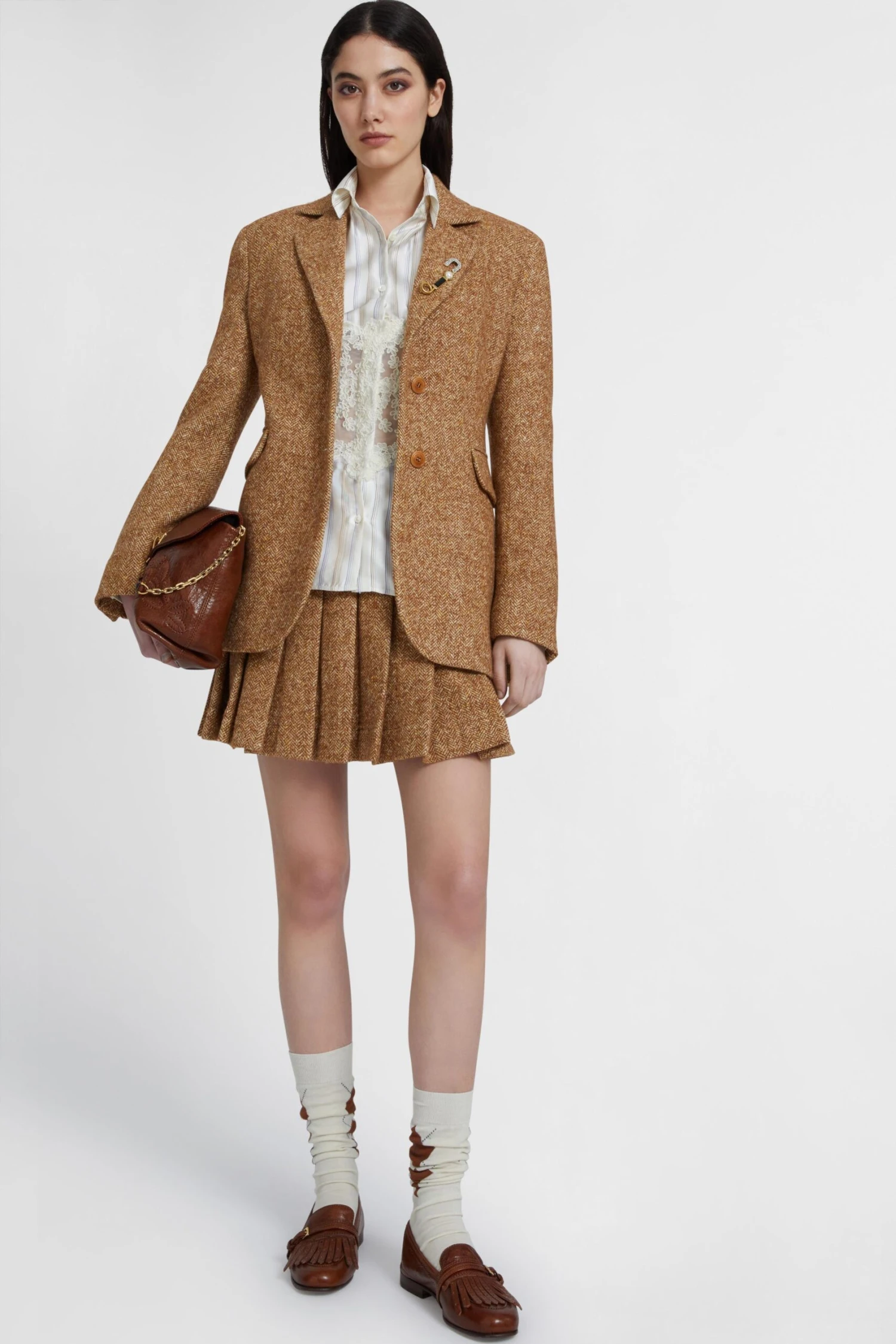 A garment with a sophisticated personality that combines the lightness of silk and the warmth of virgin wool in an elegant herringbone pattern. The single-breasted cut enhances the figure with clean, dry lines, while the jewel pin applied to the lapel, an exclusive Ermanno Scervino, adds a precious and feminine detail. Wear it with slim-cut tailored trousers for a characterful office look, or with high-waisted jeans for a more casual but always refined effect.
