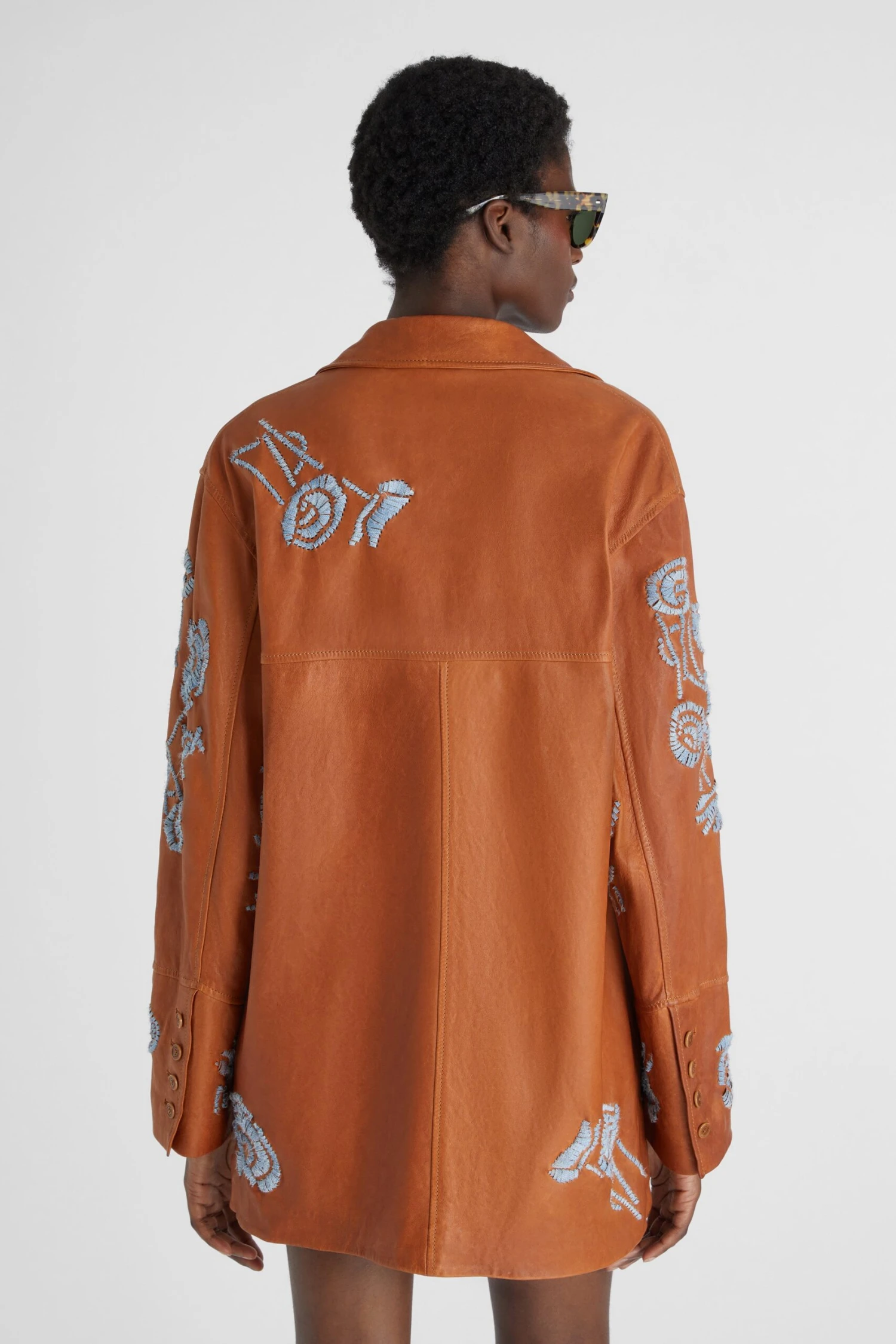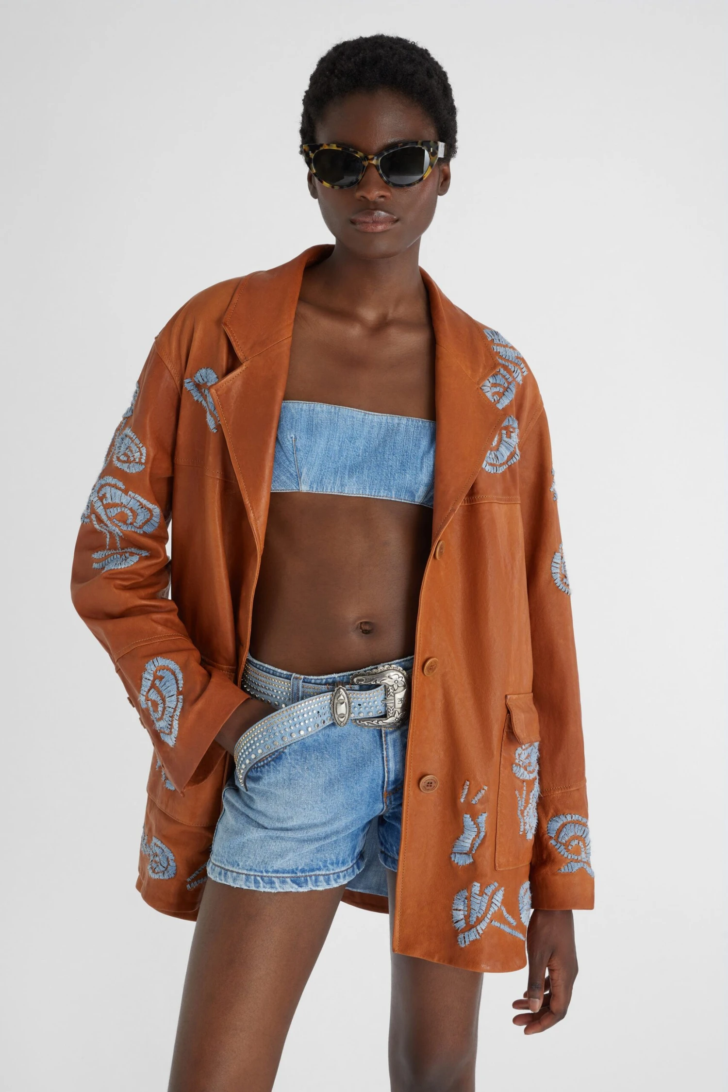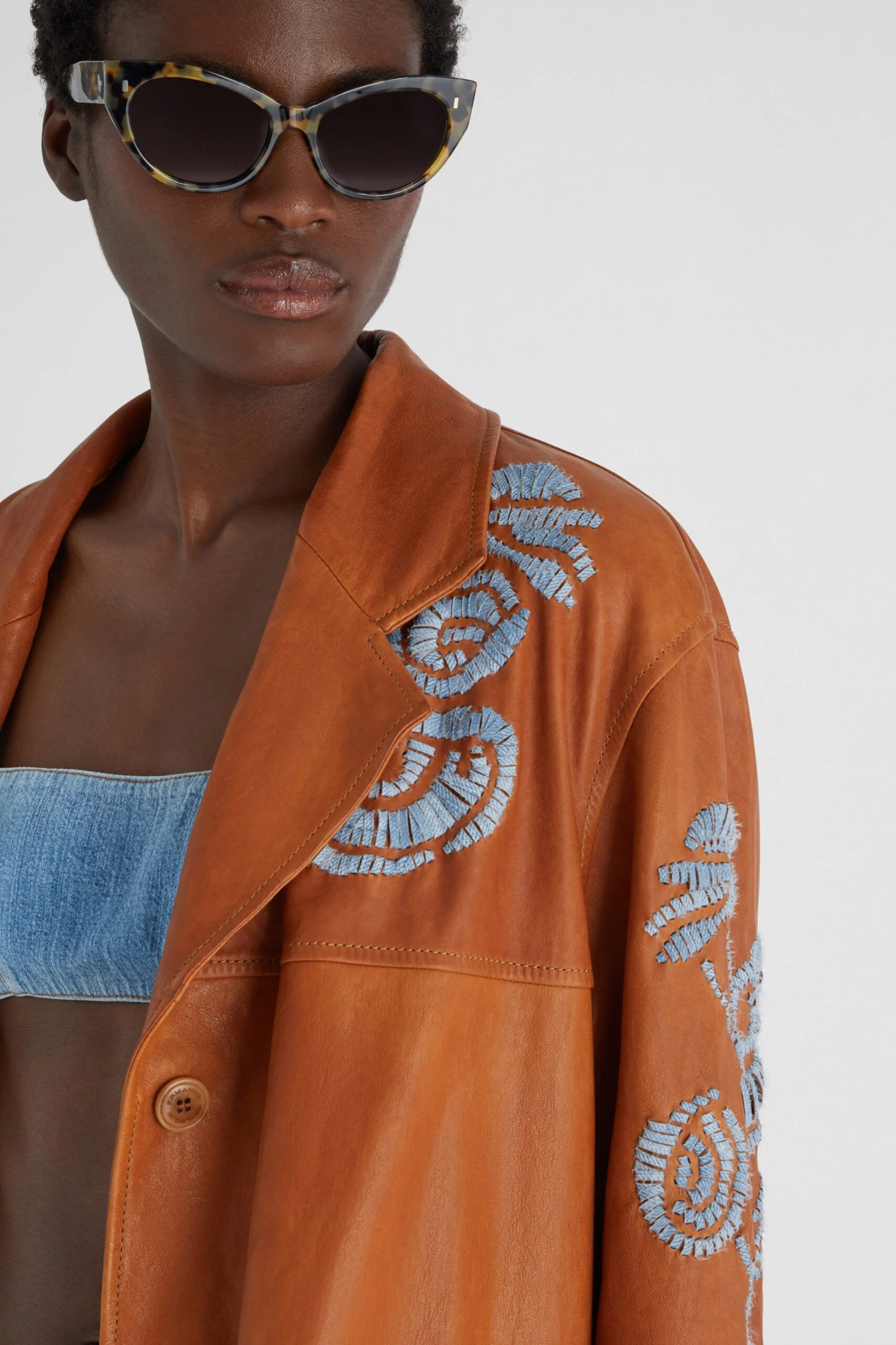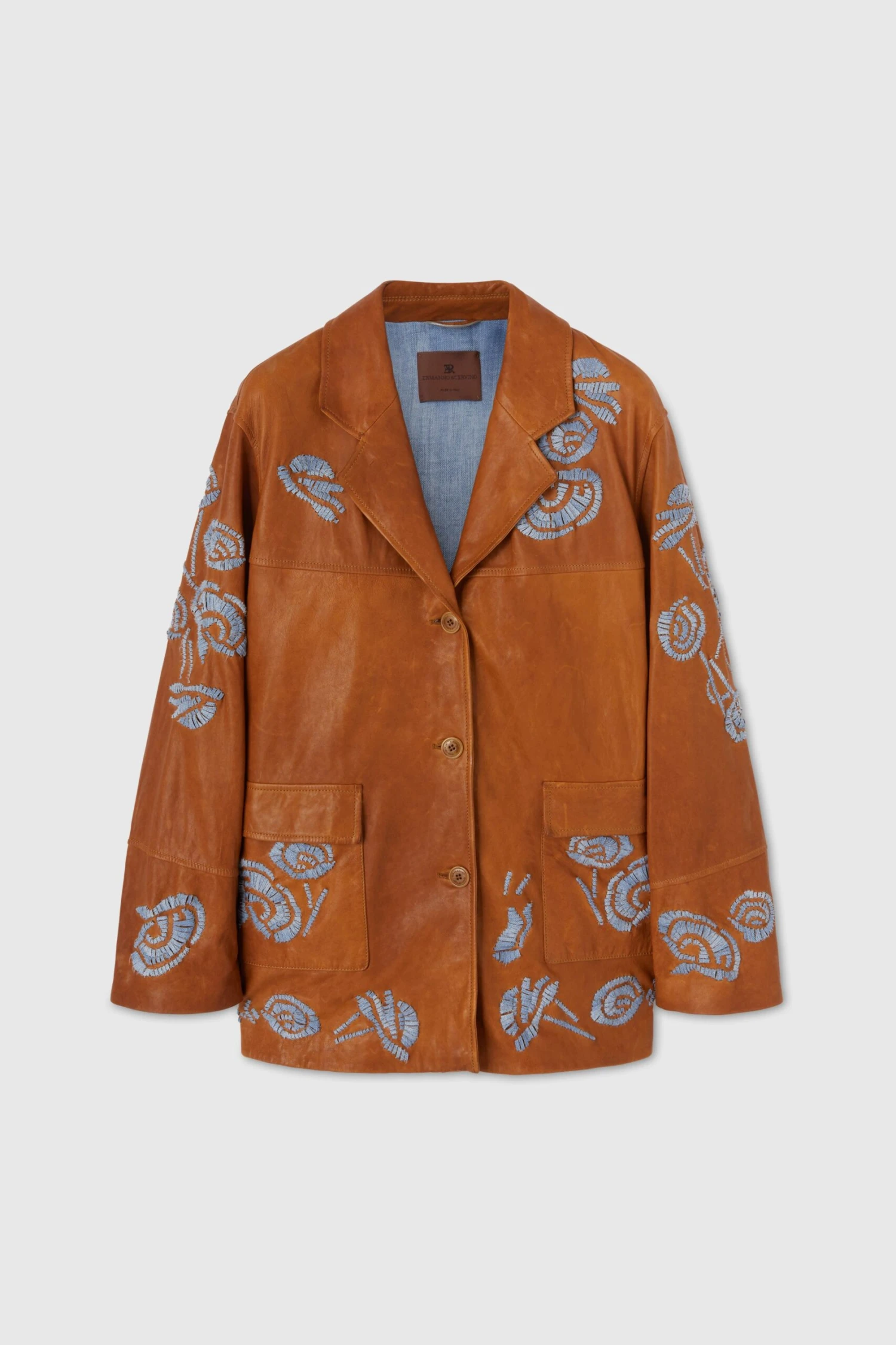 Single-breasted leather jacket with tone-on-tone front and sleeve summarys. The garment is embellished with precious handmade floral embroidery by our craftsmen, weaving a ribbon thread from our iconic denim. The contrasting effect makes the garment unique. The embroidery is developed on the shoulders and both sleeves, as well as on the front and both pockets on the hips.