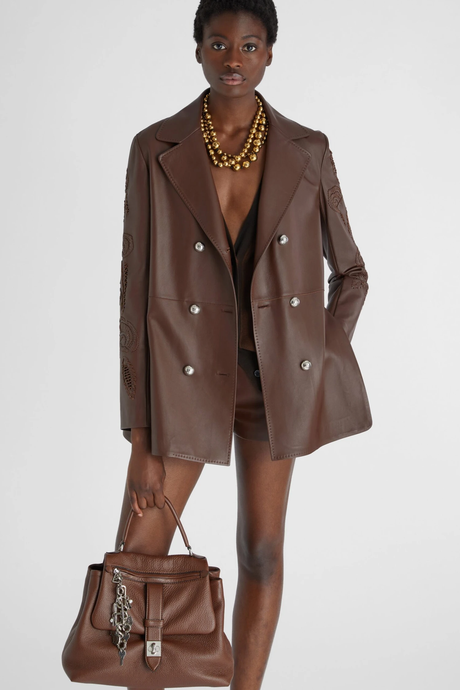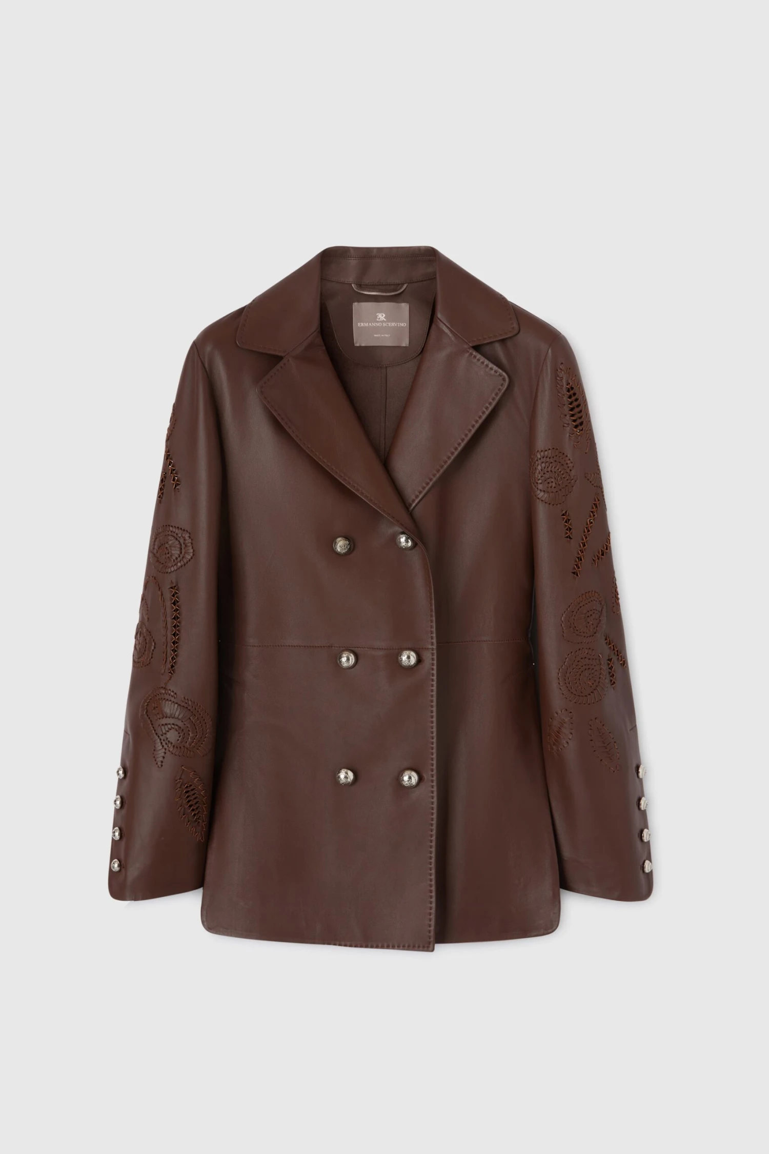 Single-breasted jacket made of soft-touch lambskin leather with silver logo military summarys on the front and sleeves. The garment is enriched by a precious floral embroidery created on both sleeves by our craftsmen, weaving a leather ribbon to match the rest of the jacket and alternating the embroidery with a cut-out effect, also created by hand.