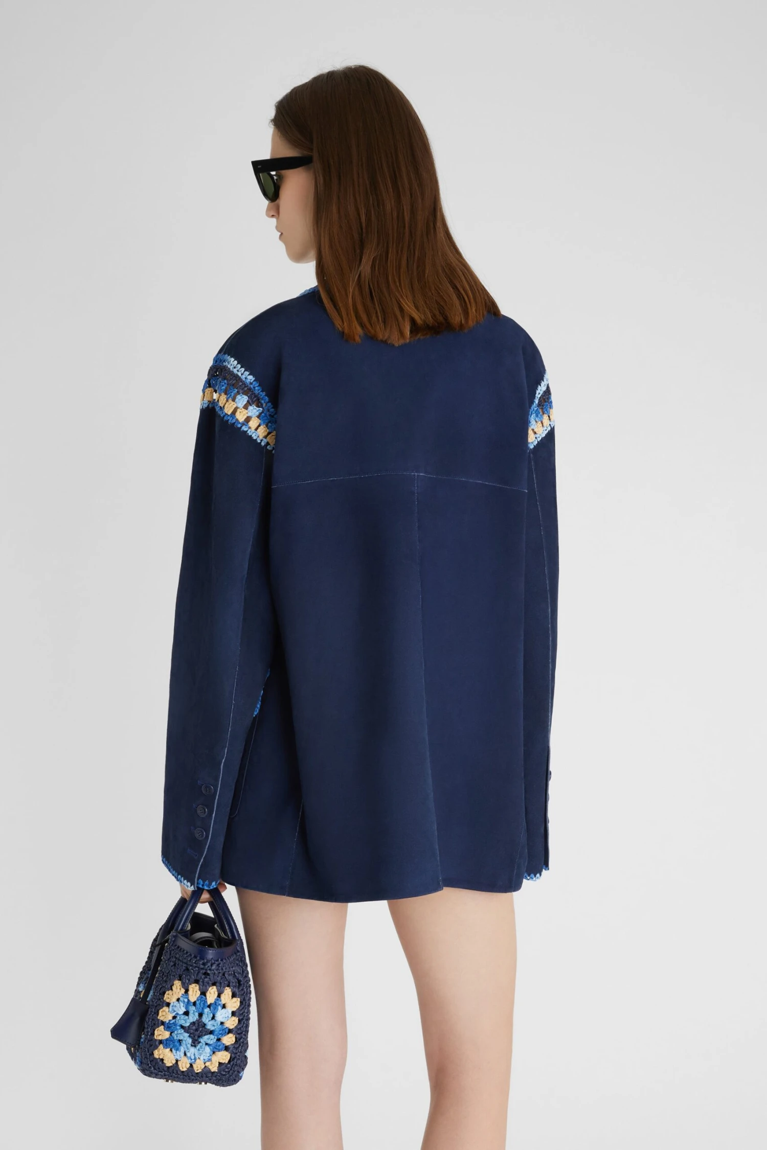 Lambskin single-breasted jacket with a soft-touch suede effect. The garment is embellished with two-tone rafia piping handmade by our craftsmen, which we find along the peaked lapels, the collar, the flaps of the hip pockets and the cuffs of the sleeves. The detail on the shoulders is very special: the sleeves seem to join to the garment by means of a multicoloured rafia check work, completely handmade and giving the garment uniqueness. The front and sleeve summarys are in tone with the colour of the jacket.