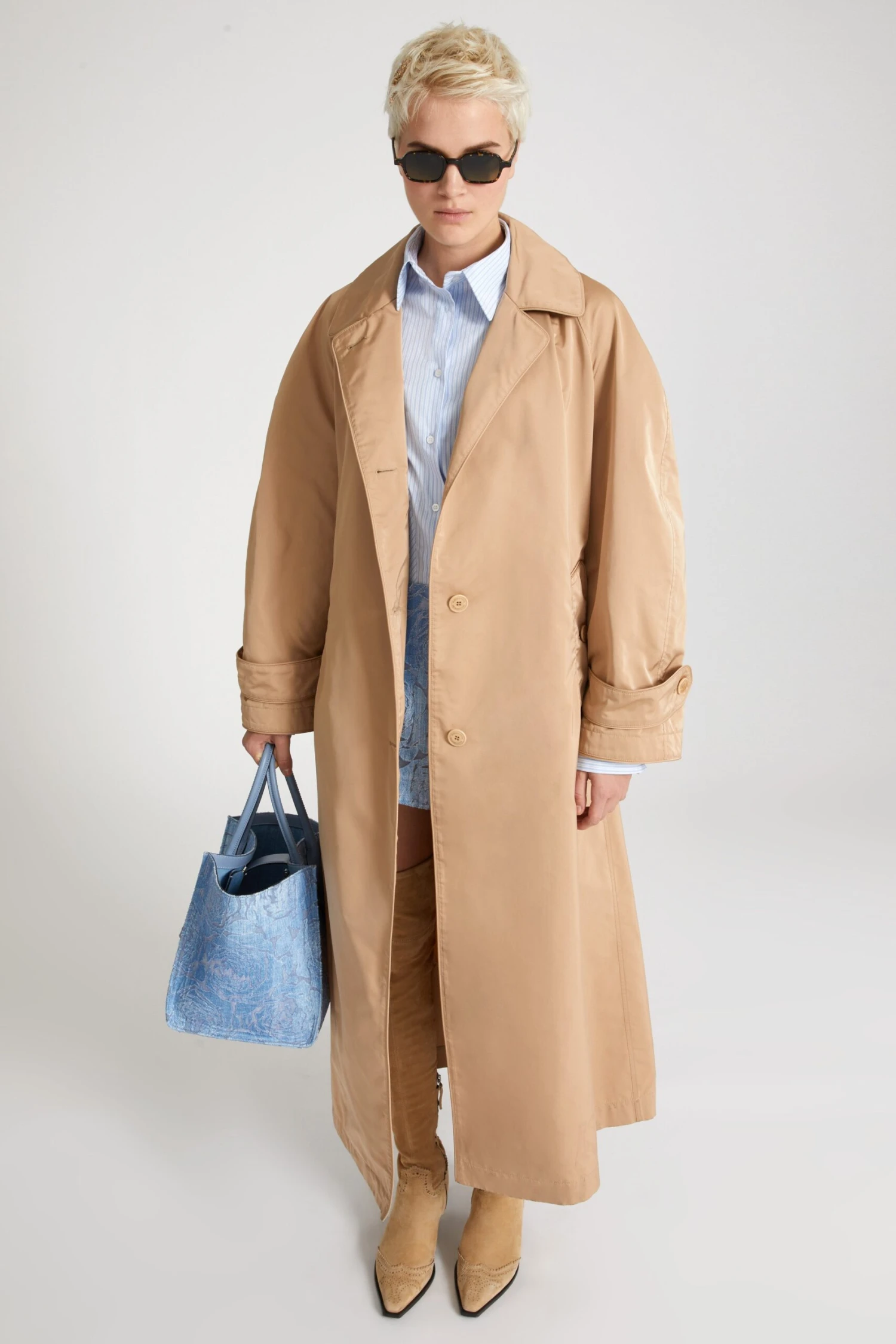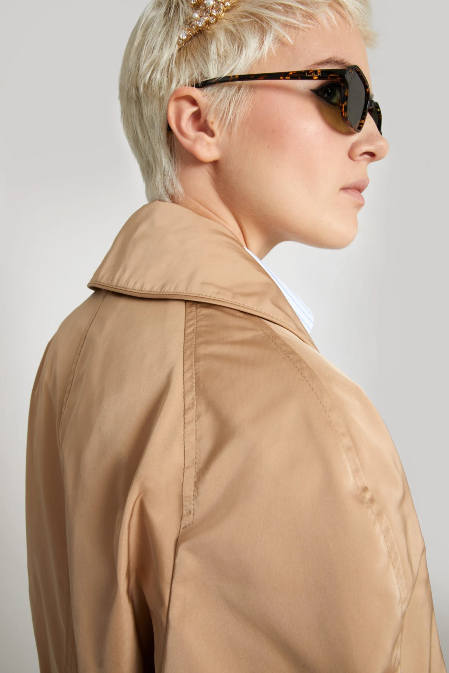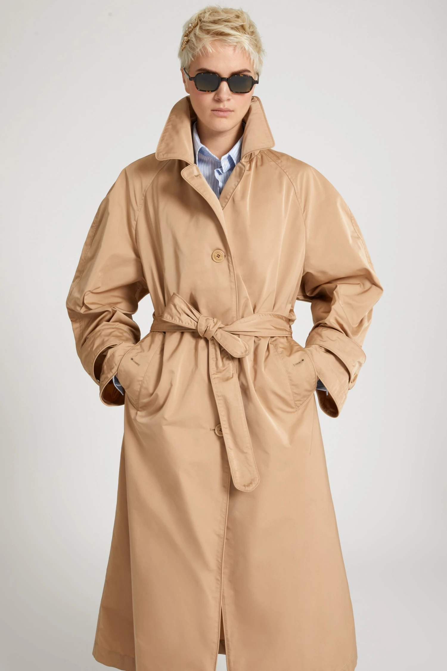 Technical duchesse single-breasted trench coat with wide peaked lapel. The garment, with its clean, wrap-around silhouette, has a matching belt in the same material. Matching stitching and piping finish the garment.