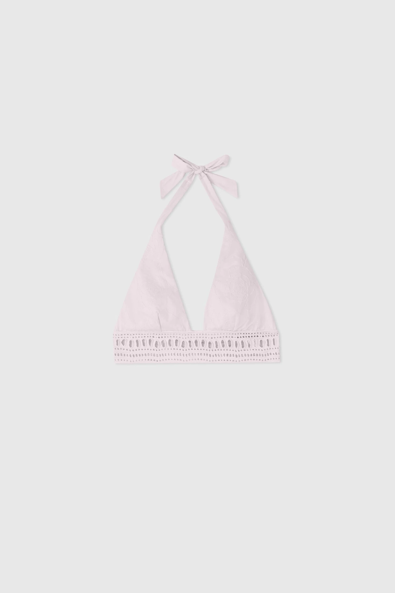 Triangle top with halter neckline and sangallo detail with a jour effect on the underbust band. The tone-on-tone floral embroidery on the triangle cup is distinctive.