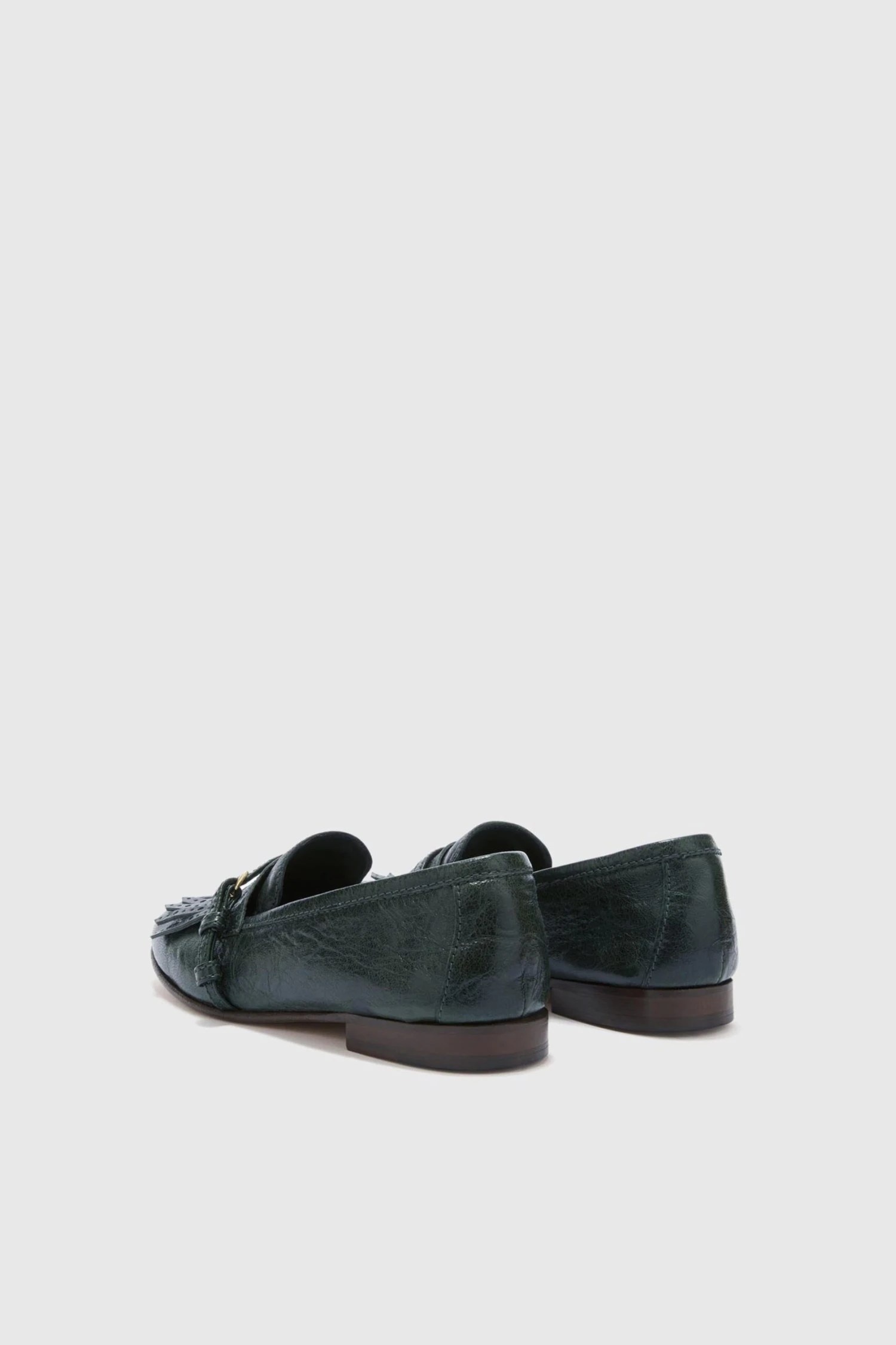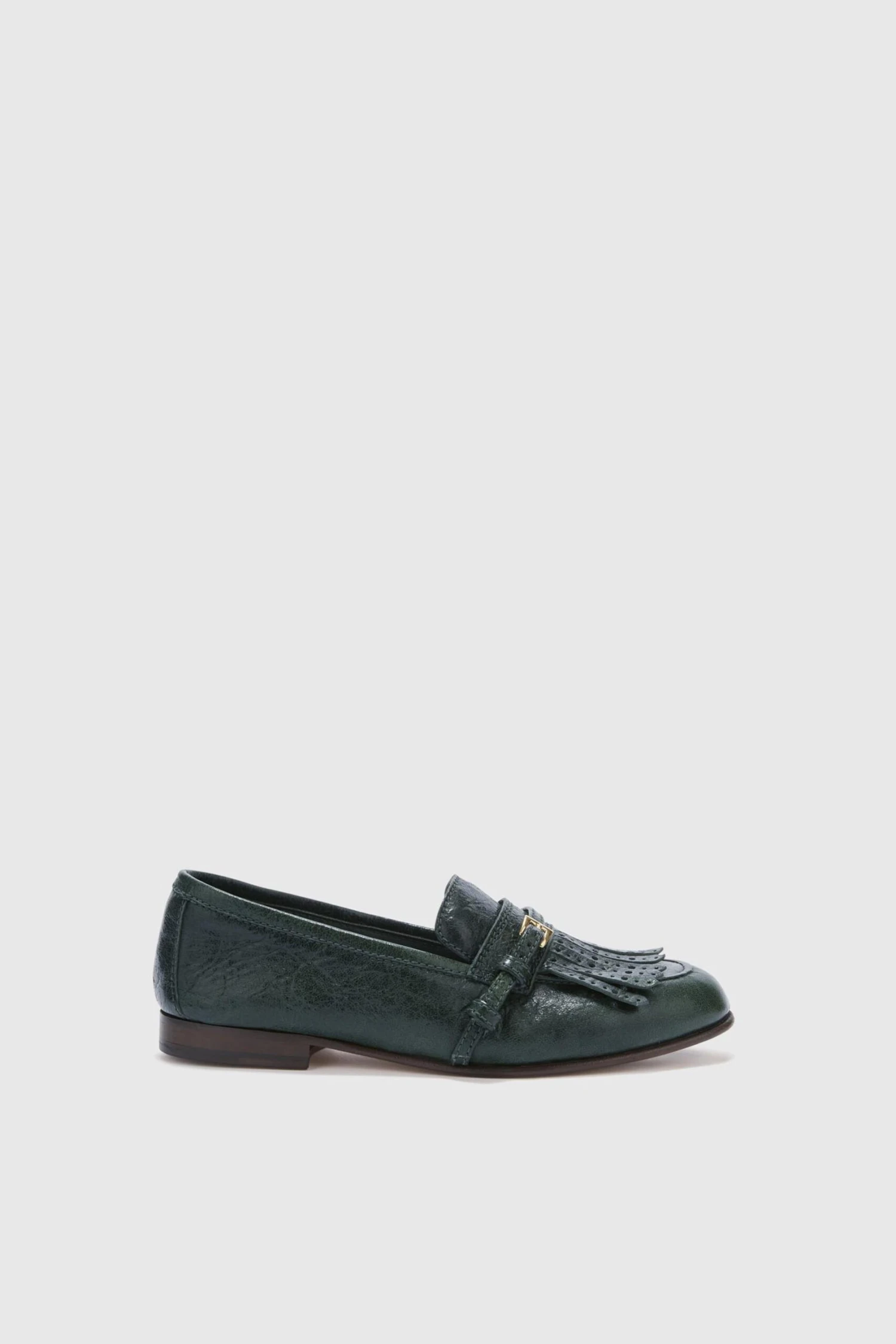 A collection debut, the vintage-effect forest green nappa College loafer interprets the classic with a bold and sophisticated touch. The incredibly soft and flexible hazelnut-colored leather sole makes it pocketable and perfect for everyday elegance. Entirely hand-finished, the design is enriched by a brogue motif that accompanies the fringes to the tip, held in place by a buckled strap that adds personality and structure. Ideal to pair with argyle socks and skirts from the collection, for sophisticated and contemporary looks.