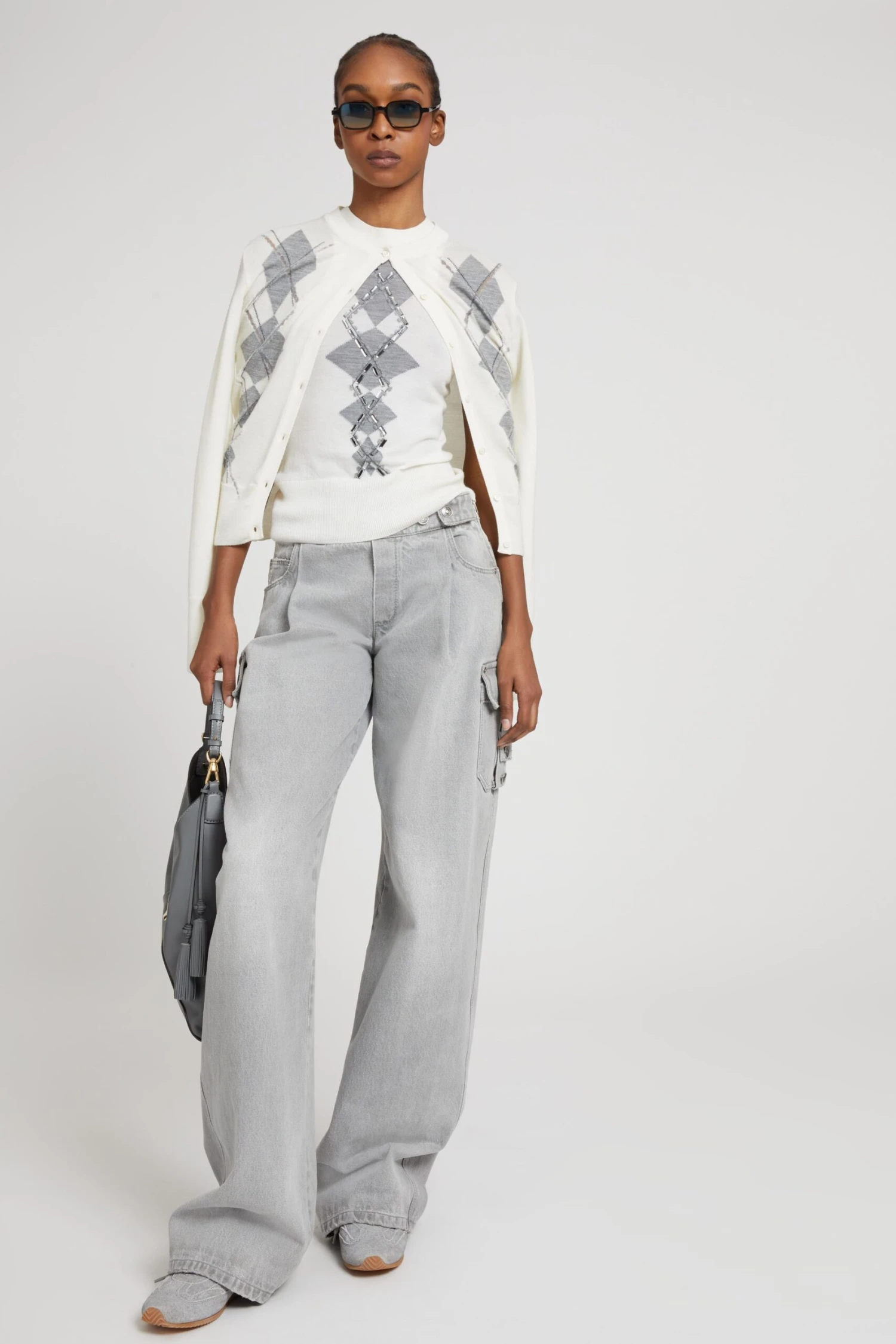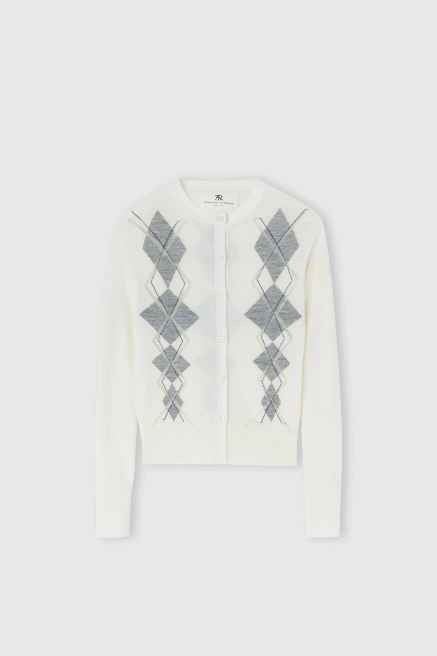 Perfect to wear with men’s shirts or satin tops for a contrast of style and texture, this cardigan lends itself to both casual and elegant interpretations, expressing a decisive and modern femininity. It can also be paired with tops and vests with the same argyle pattern for a perfect twin set, ideal for a harmonious and stylish look.
