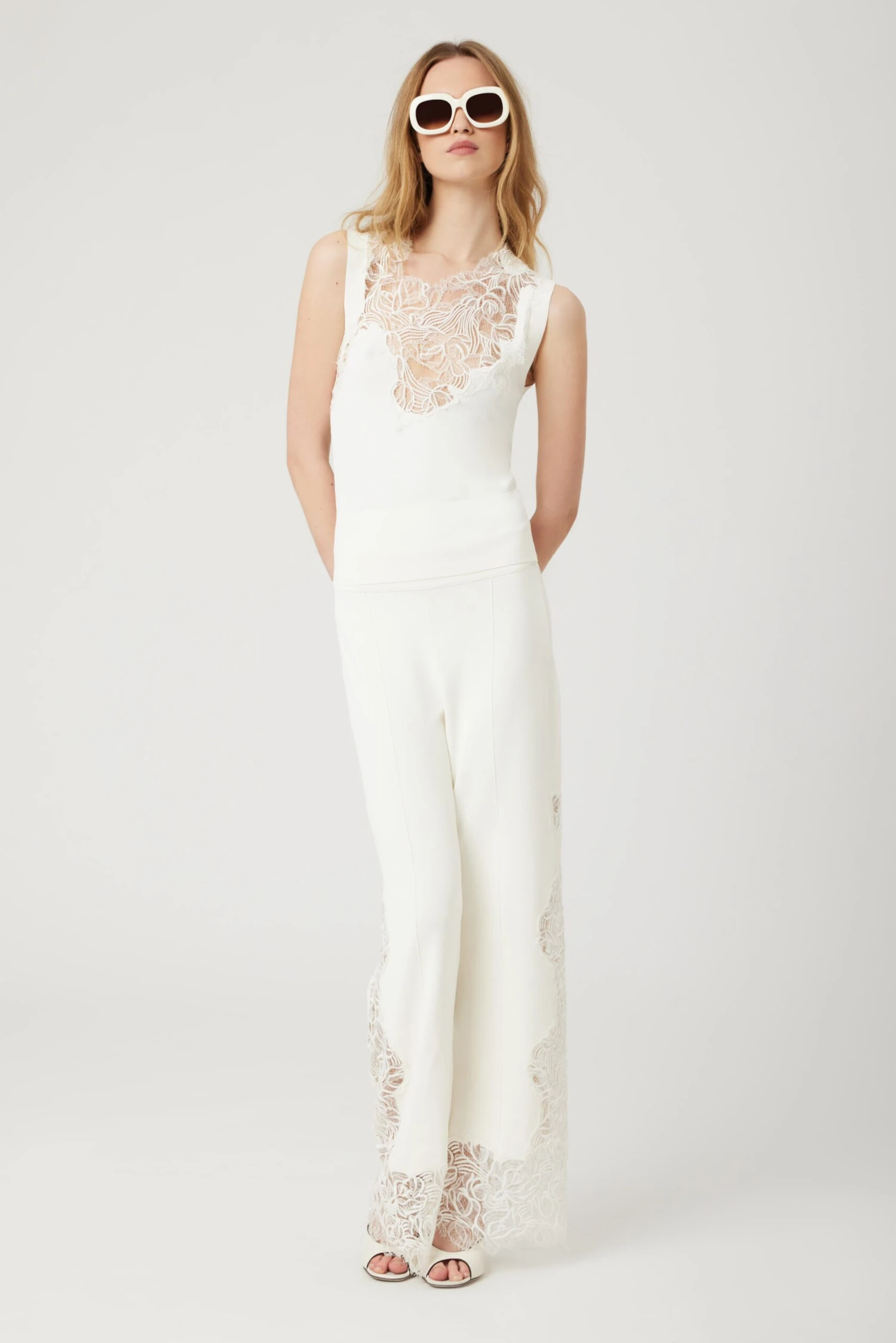 Viscose blend top, with a compact, shaved weave and wide shoulder strap. The lace detail at the top is created by overlapping macrame on Chantilly lace, both tone-on-tone.