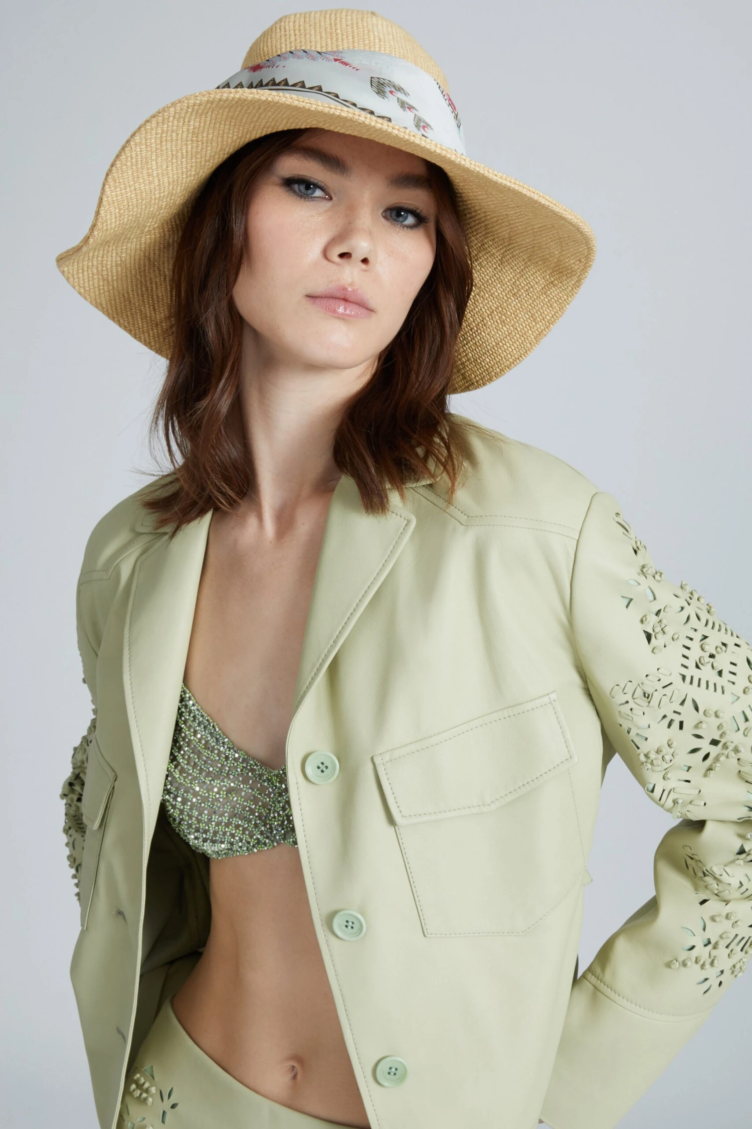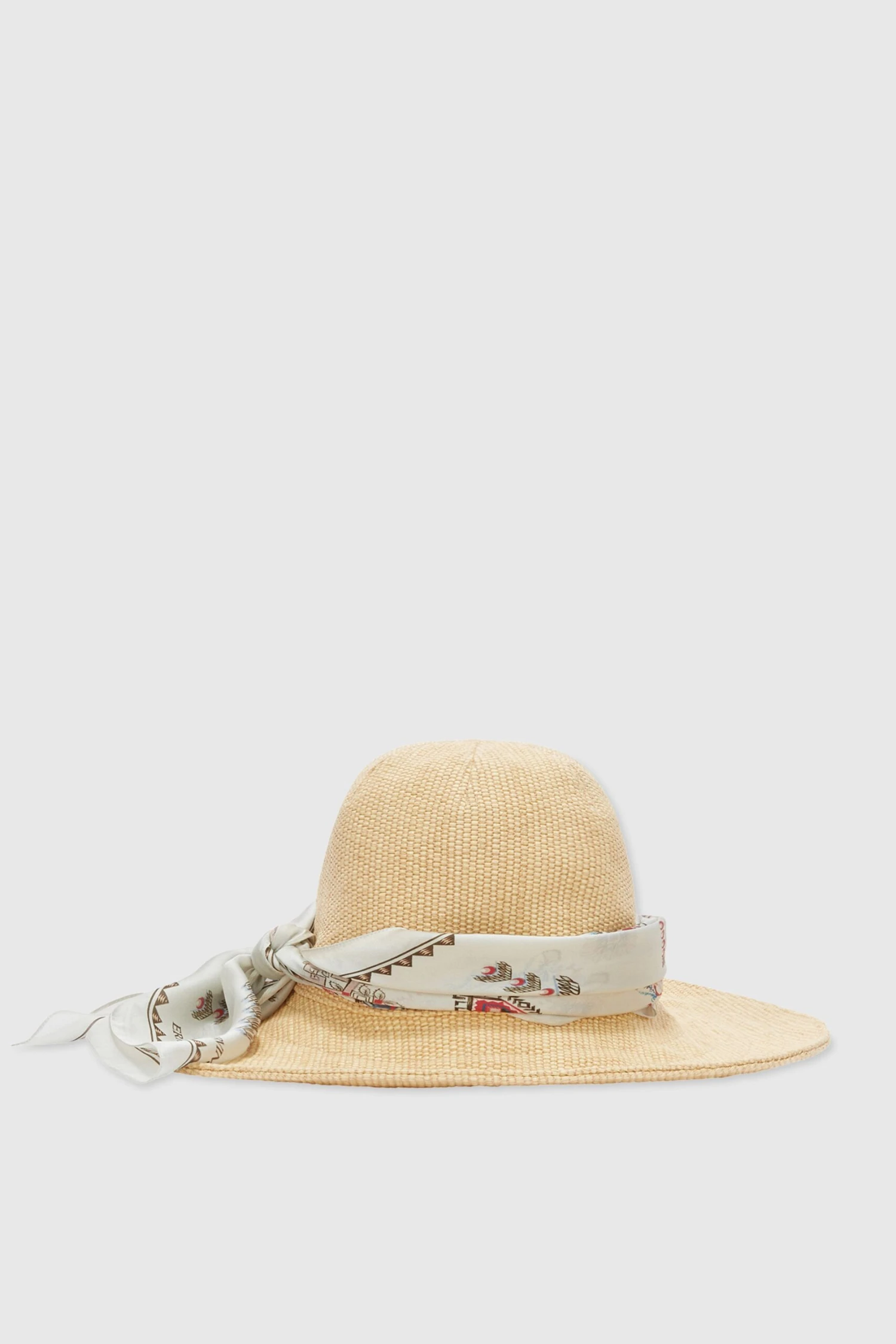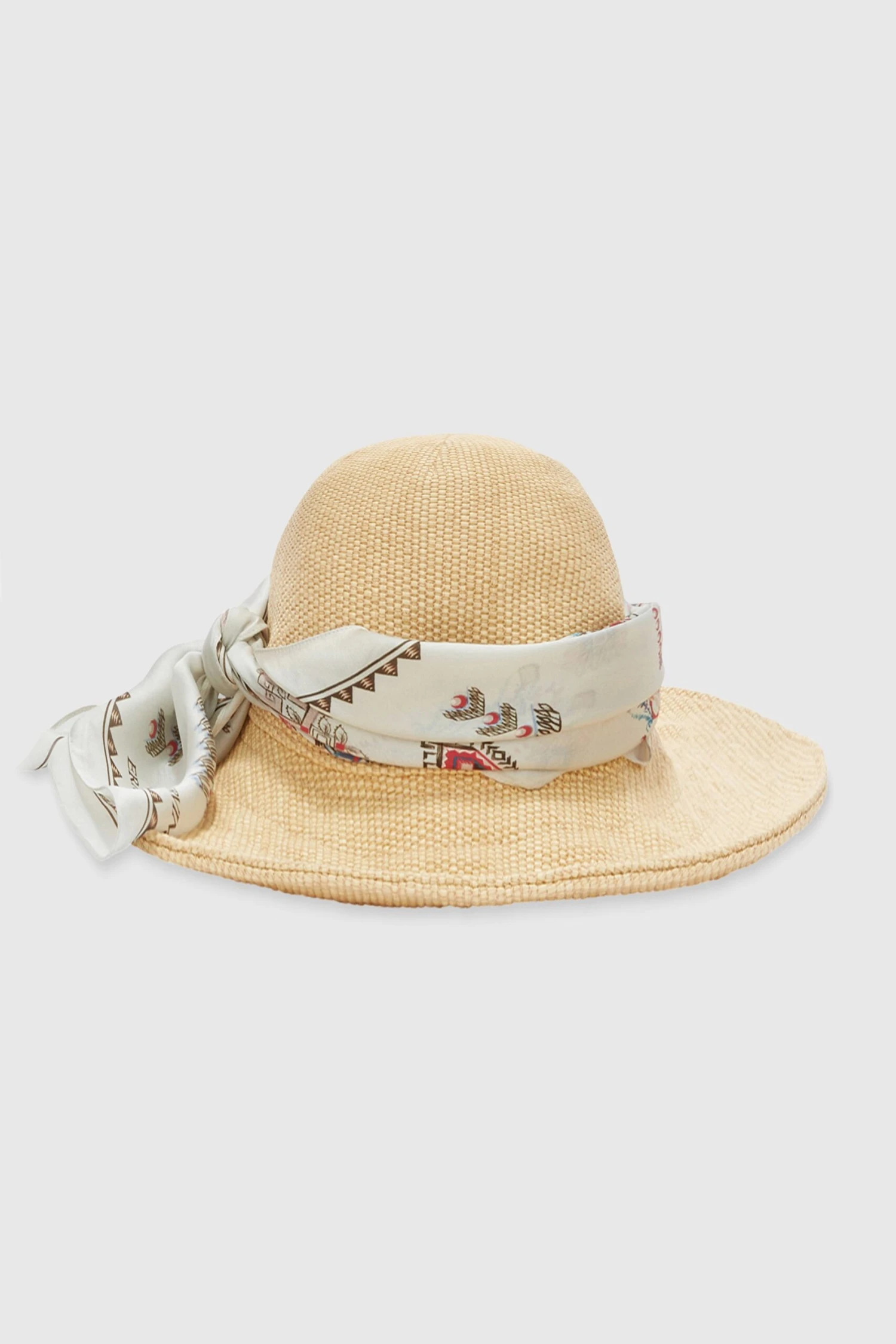 Wide-brimmed hat made of woven viscose rafia. The hat is embellished with a geometric print silk sash.