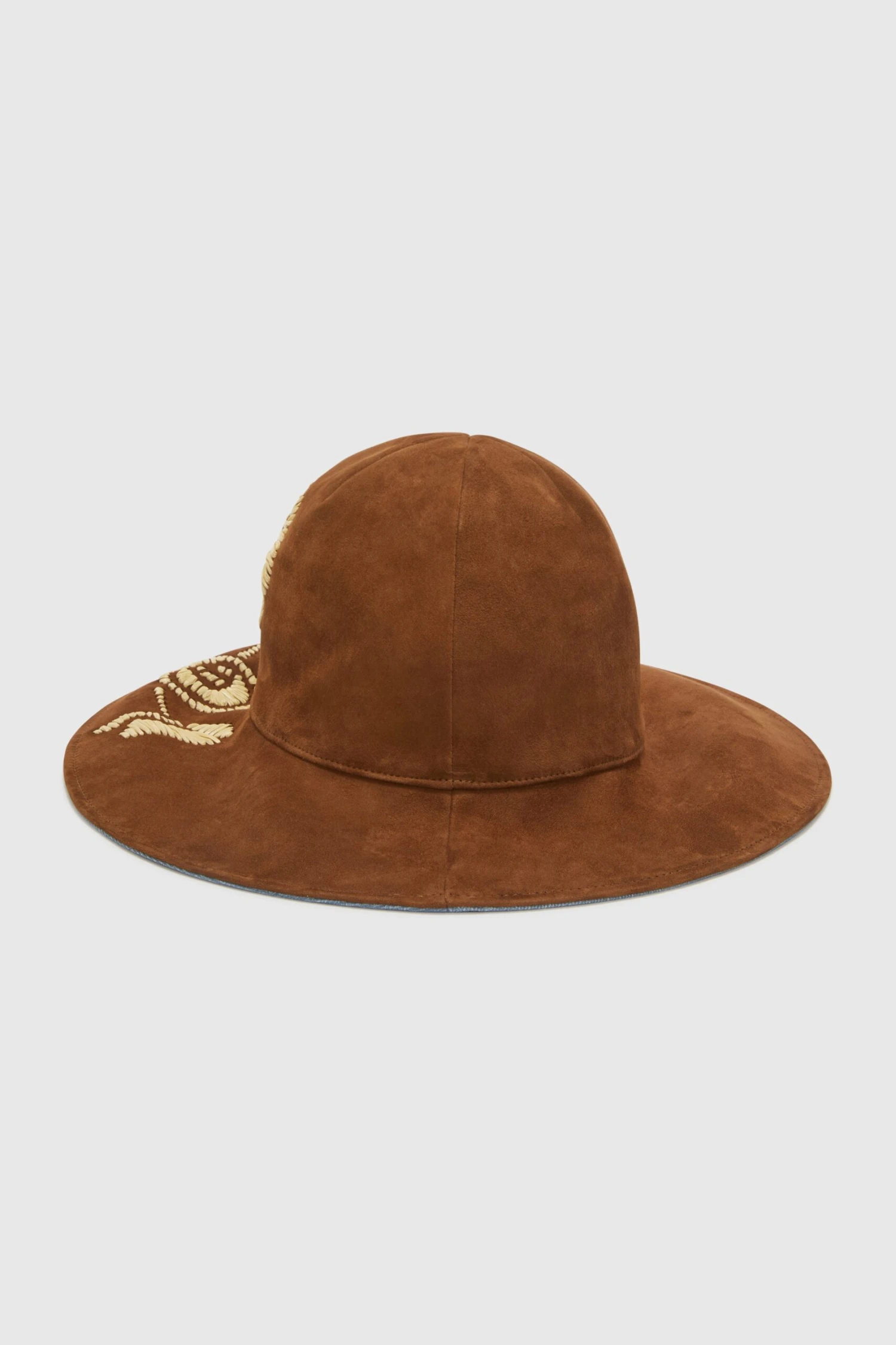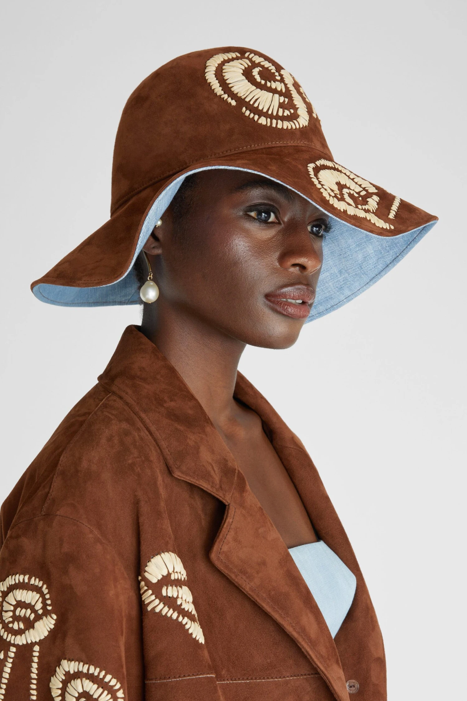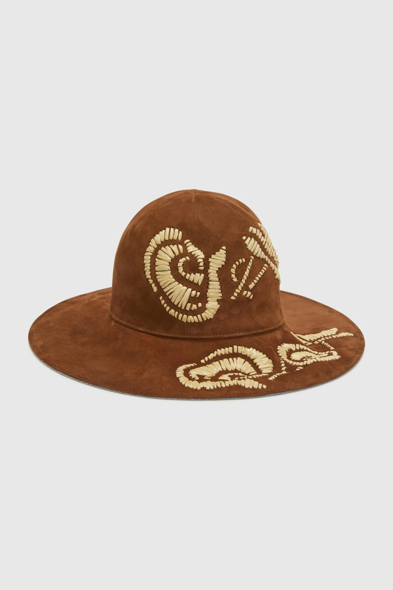 Wide-brimmed hat in crust leather, with contrasting natural rafia floral embroidery, handmade by our artisans. The interior of the hat is in jeans-print marocain, the iconic Ermanno Scervino fabric, a contemporary tribute to the classic texture of denim.