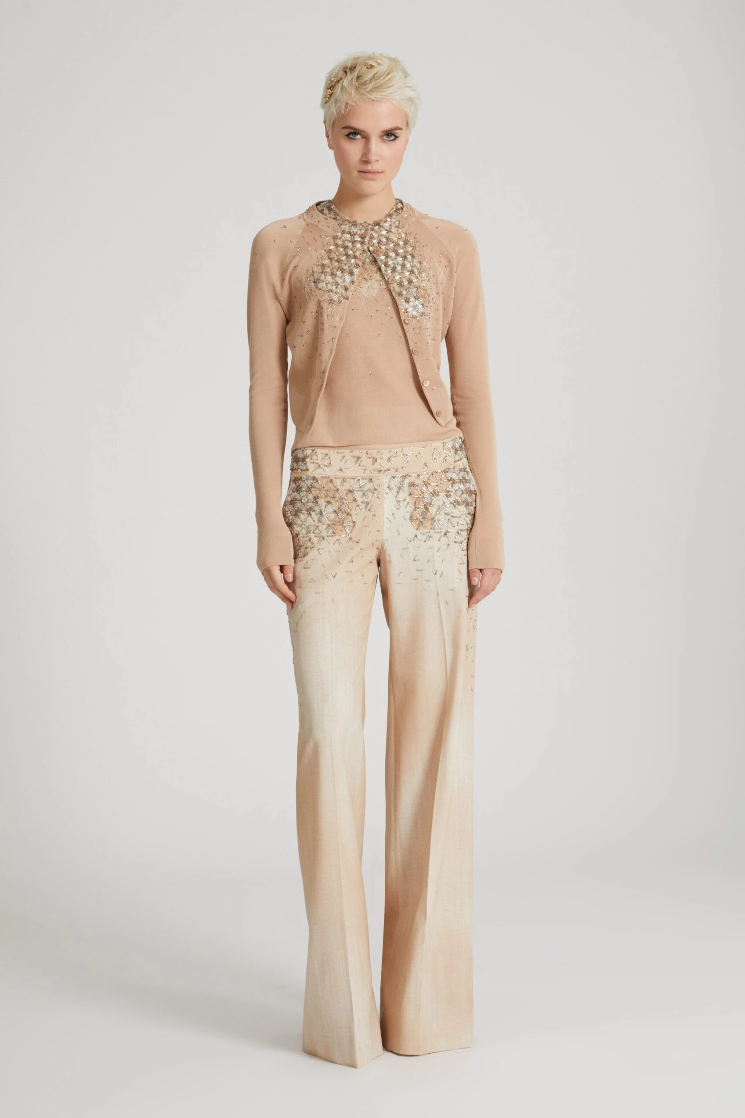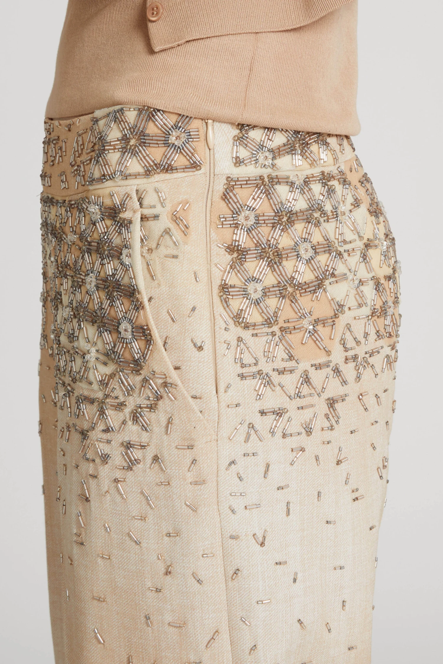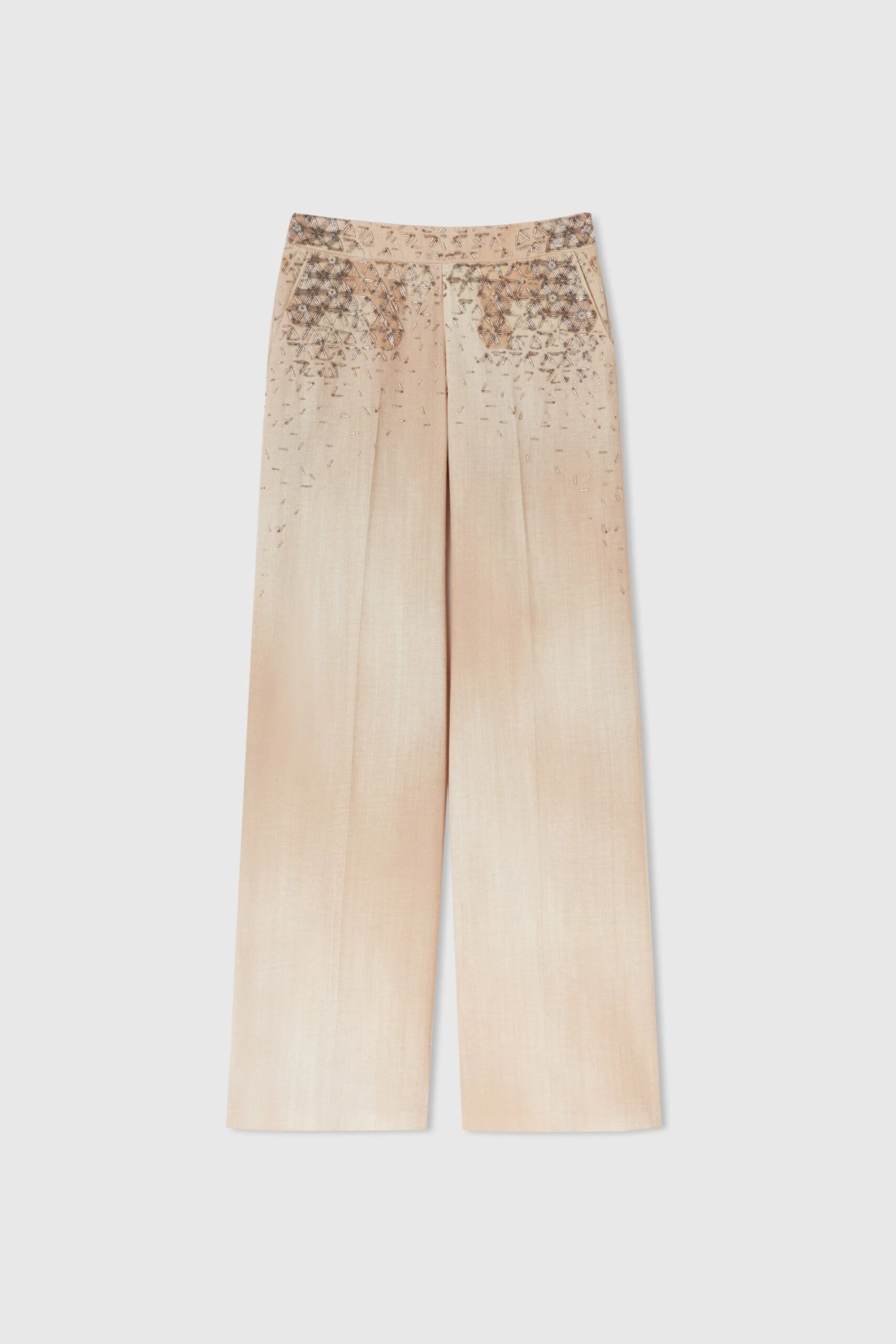 Wide trousers with low waist in marocain viscose denim print enriched by hand embroidery made of beads positioned in a geometric pattern on a tulle base. Internal fabric belt and invisible zip on the side.