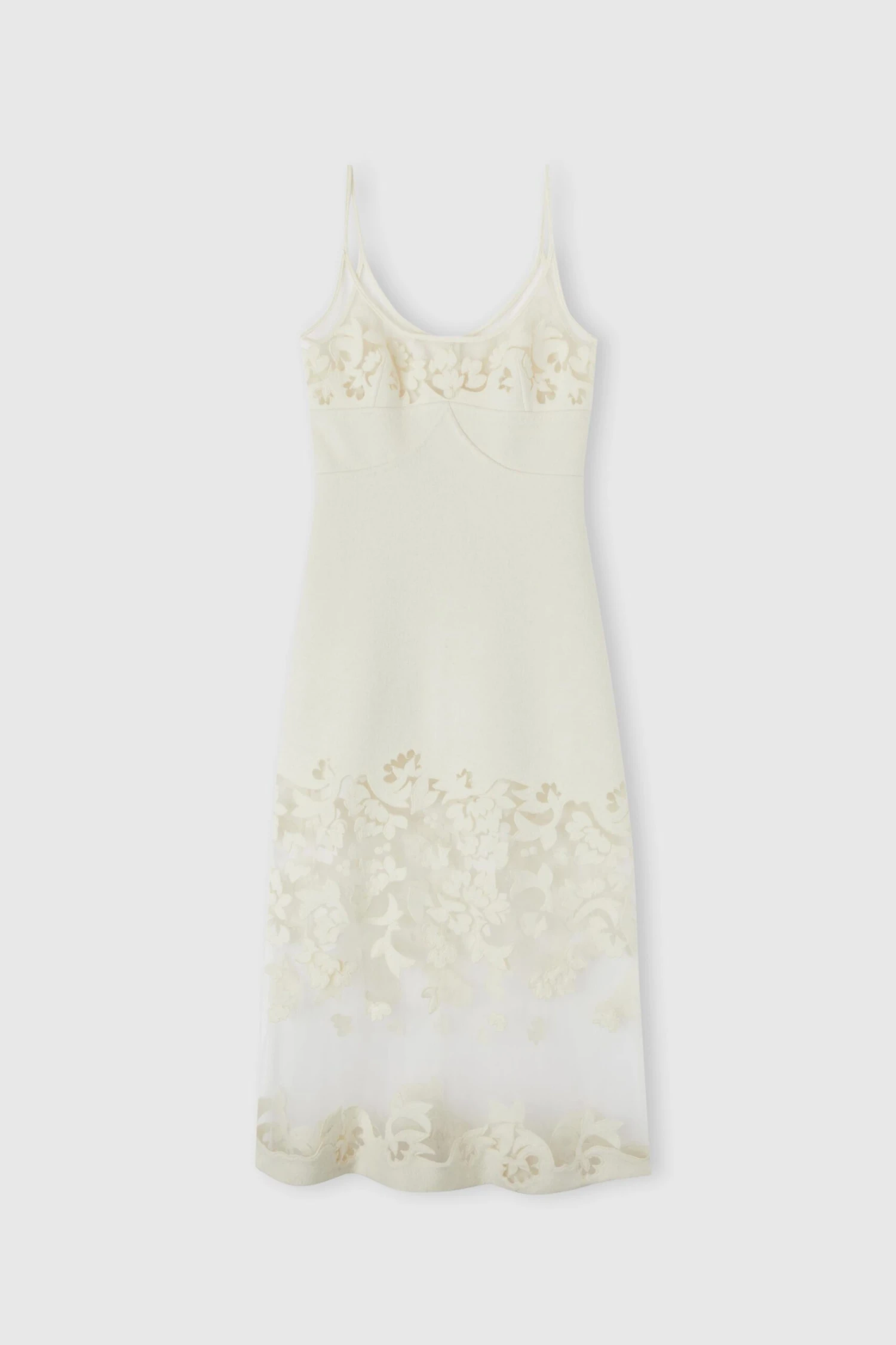 An intimate and sophisticated elegance takes shape in this midi dress with a lingerie cut, which delicately slides on the silhouette thanks to the precious mix of wool and silk. The essential design is enriched by a refined floral motif created with the inlay technique, an artisanal process that plays with textures and transparencies to create a delicate but high-impact visual effect. The thin shoulder strap highlights the feminine and minimal allure of the garment, making it perfect for elegant and contemporary interpretations.
