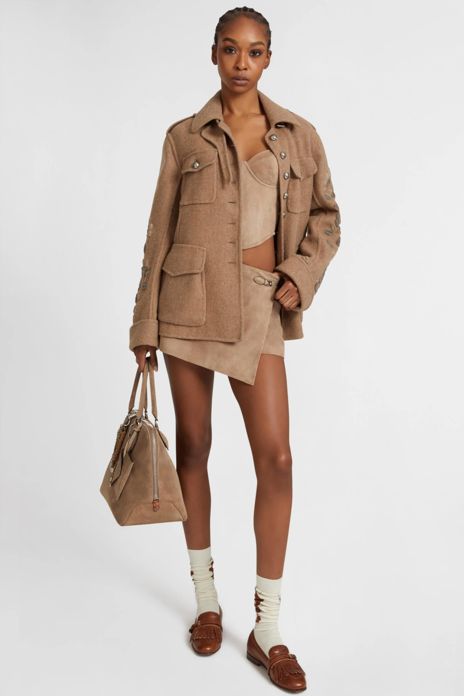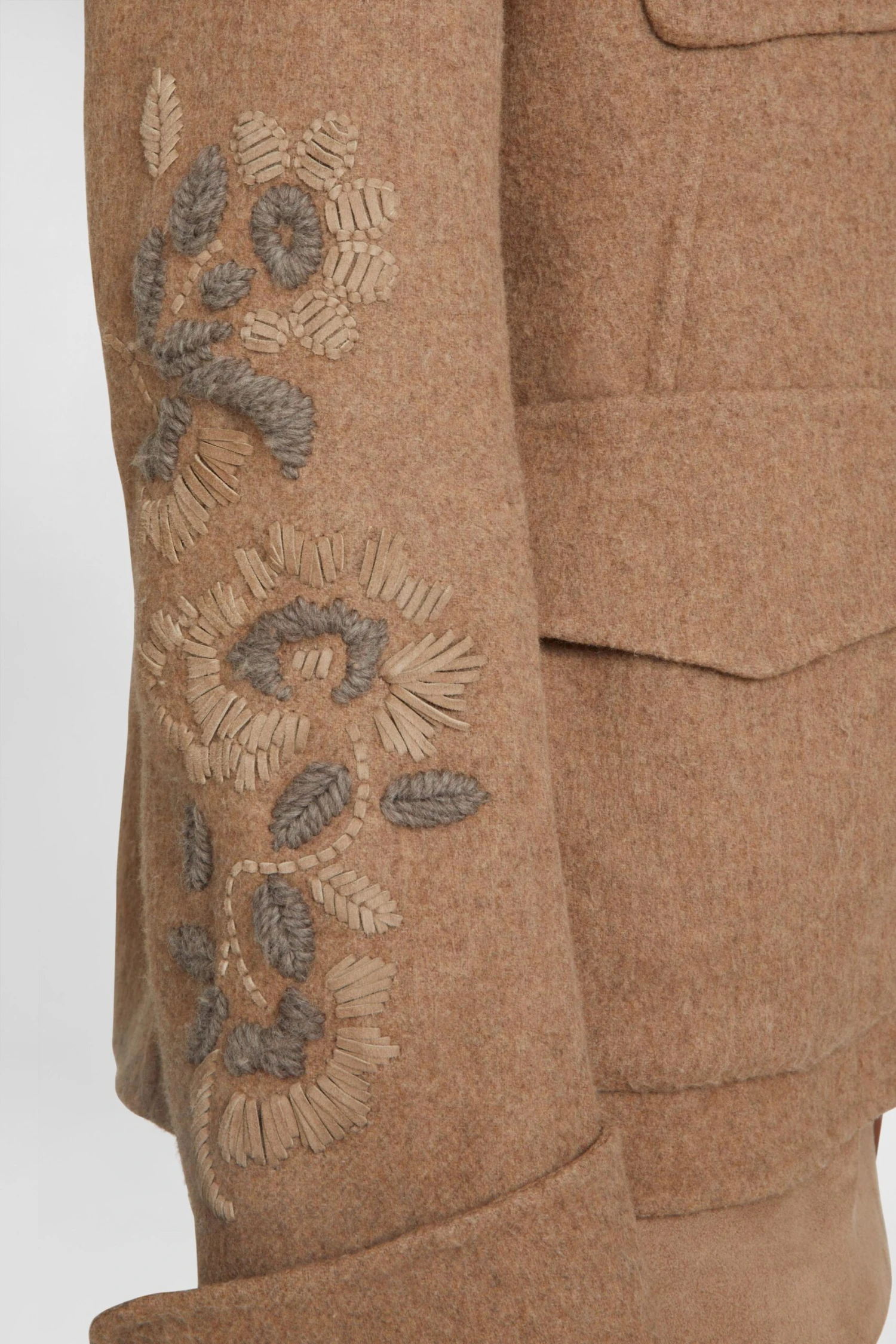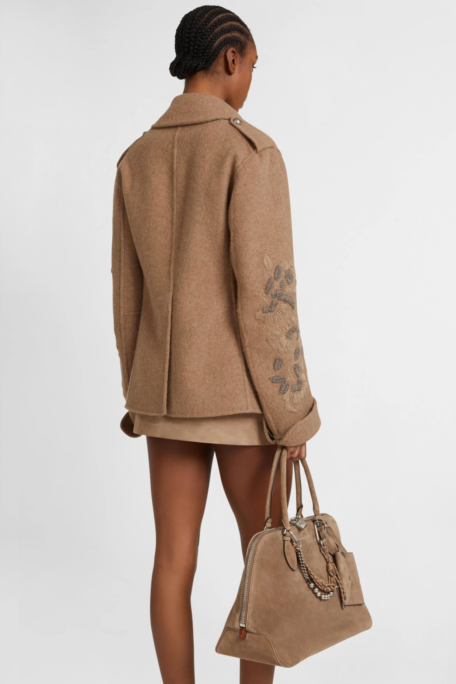 Military inspiration and craftsmanship meet in this Ermanno Scervino coat, crafted from a warm wool blend. The structured lines of the design, emphasized by the bellows pockets and the jeweled summary closure, are softened by the exclusive three-dimensional floral embroidery, hand-crafted with wool yarns and positioned on both sleeves. A garment that combines character and femininity, perfect for elevating any everyday look.