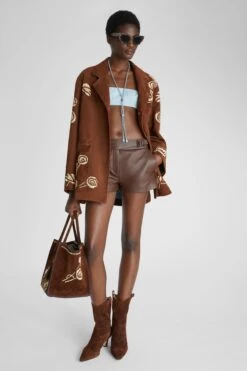 ERMANNO SCERVINO Single-breasted Suede Jacket With Handmade Contrasting Rafia Floral Embroidery