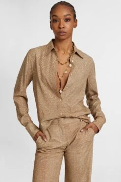 ERMANNO SCERVINO Viscose Shirt With Hand-applied Crystals And Herringbone Pattern In Shades Of Beige